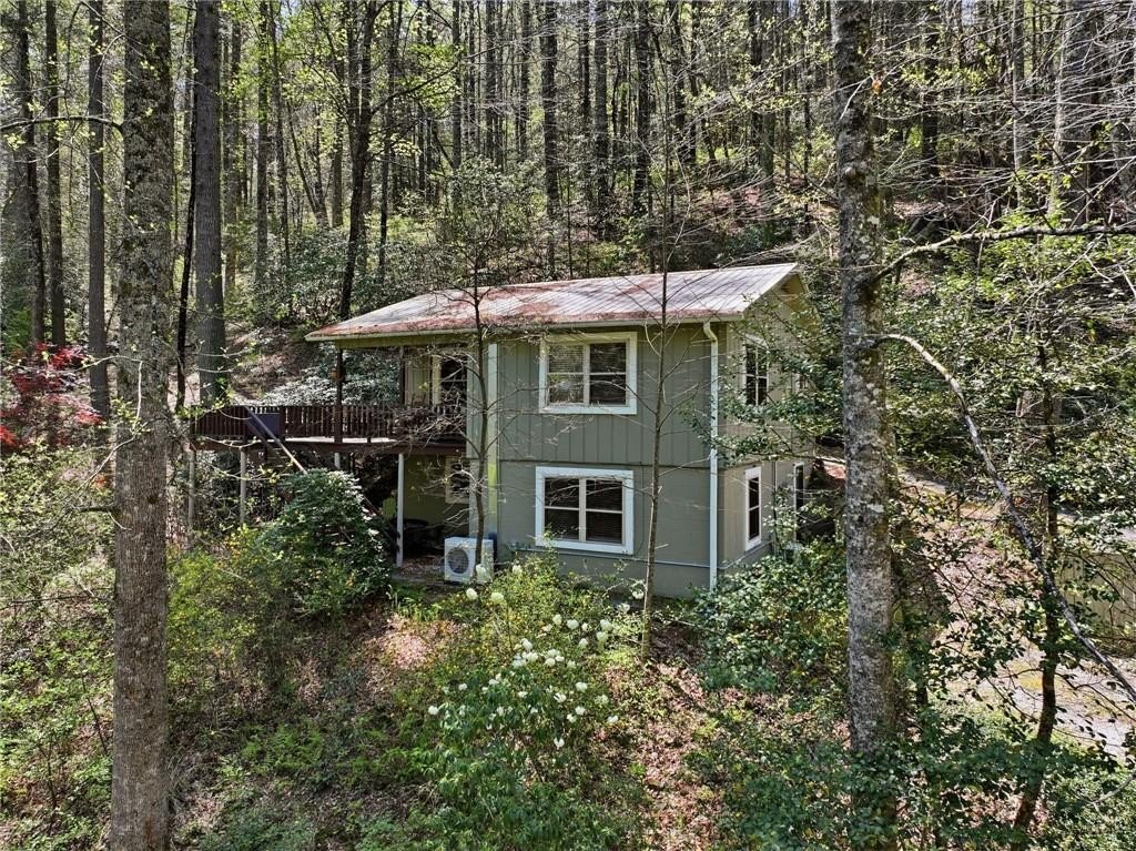 Your dream mountain escape awaits! Incredible retreat bordering the National Forest, ideal for hunters, anglers, and nature lovers seeking peace, privacy, and the soothing sounds of cascading water. This handyman special features a spacious 4BR/3BA, two-story A-frame style home nestled on over 3 scenic acres in a quiet, secluded valley north of Cleveland and Dahlonega, with direct frontage on the East Fork of the Chestatee River (Frogtown Creek). Remote and secluded, yet easily accessible via paved drive and county road, this property offers the perfect balance of privacy and convenience. Inside, enjoy vaulted cathedral ceilings with exposed wood beams, two separate stone wood-burning fireplaces, a sun-filled sunroom overlooking the trout stream, and a versatile loft/attic space. The home offers large upper and lower decks perfect for relaxing or entertaining while taking in breathtaking forest and water views. Additional features include a walk-in crawlspace ideal for a workshop or hobby area, a roof approximately 6 years old, and an abundance of fruit and nut trees including black walnut, plum, apple, and pear. Two old spring box holding tanks offer potential for spring water use. The property boasts approximately 100 feet of trout stream frontage and several hundred feet bordering National Forest, providing direct access to hunting, hiking, waterfalls, and endless outdoor adventure. Set in a beautiful valley setting, this is a rare opportunity to own a true slice of paradise deep within the National Forest, with multiple scenic waterfalls that can be hiked to directly from your land. Properties like this are rarely available. Priced to sell and ready for your vision! Schedule your private tour today and make this one-of-a-kind retreat your own!
